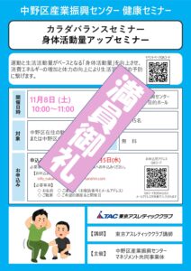 【10月16日更新】好評につき満席となりました。ありがとうございました!【開催日】11月8日(土)、カラダバランスセミナー・身体活動量アップセミナー