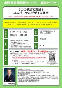 【開催日】11月19日(水)、経営セミナー 3つの観点で実践!ユニバーサル経営 ~ハード・ソフト・ハート、3つの視点からUDを実践する方法を学びます~